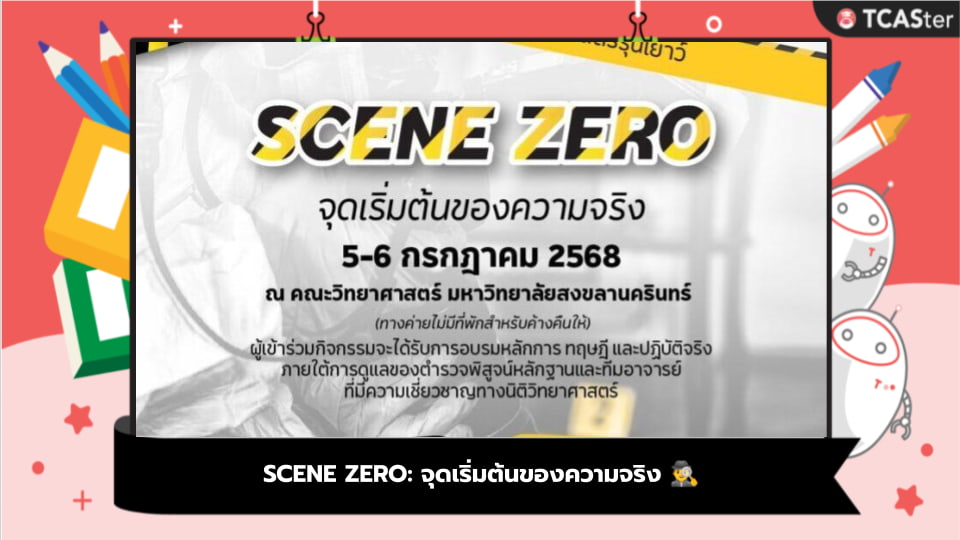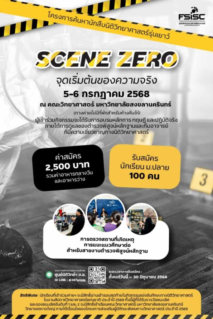สำหรับน้อง ๆ ระดับชั้นมัธยมศึกษาตอนปลายที่สนใจสายงานด้านการพิสูจน์หลักฐาน หรือนิติวิทยาศาสตร์ ปีนี้ศูนย์นวัตกรรมและบริการนิติวิทยาศาสตร์ คณะวิทยาศาสตร์ มหาวิทยาลัยสงขลานครินทร์ ขอเชิญชวนเข้าร่วมโครงการค้นหานักสืบนิติวิทยาศาสตร์รุ่นเยาว์ “SCENE ZERO จุดเริ่มต้นของความจริง” กับกิจกรรมเวิร์กช็อปสุดเข้มข้น เต็มอิ่ม 2 วัน ที่ทั้งสนุก ได้ความรู้ และลงมือปฏิบัติจริง ภายใต้การดูแลของตำรวจพิสูจน์หลักฐานและทีมอาจารย์ที่มีความเชี่ยวชาญทางนิติวิทยาศาสตร์