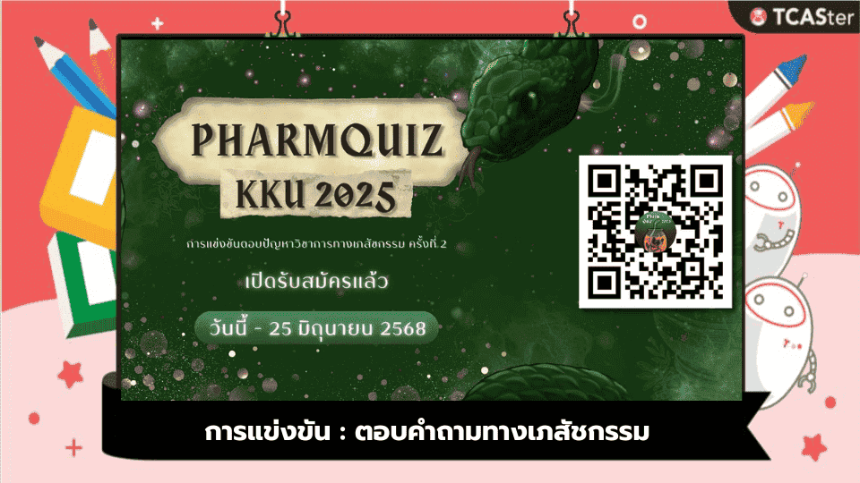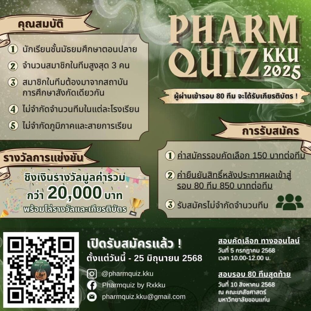 เตรียมพบกับ กิจกรรม PharmQuiz KKU 2025 การแข่งขันตอบคำถามความรู้ทางเภสัชกรรมสุดมันส์ ชิงเงินรางวัลมูลค่ารวมดว่า 20,000 บาท! พร้อมเกียรติบัตรสำหรับผู้ผ่านเข้ารอบ 80 คนสุดท้าย!