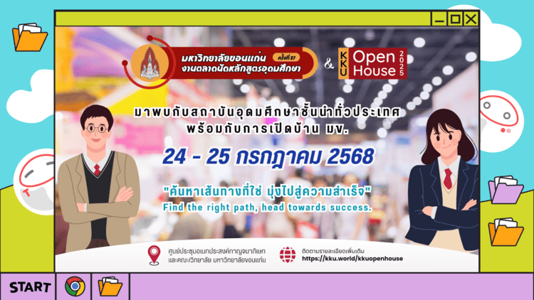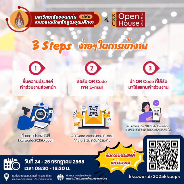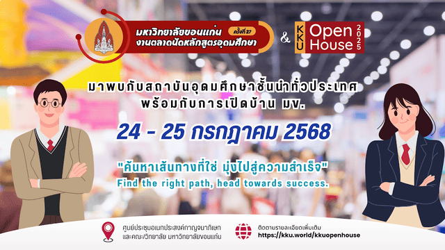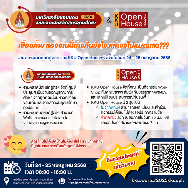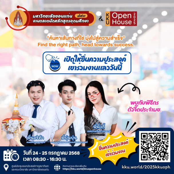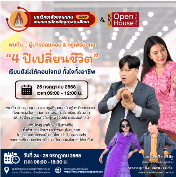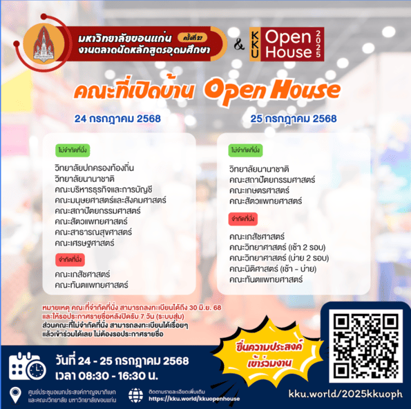 - ตลาดนัดหลักสูตรจัดที่ศูนย์ประชุมอเนกประสงค์กาญจนาภิเษก และ KKU Open House 2025 จัดที่คณะ/วิทยาลัย มหาวิทยาลัยขอนแก่น