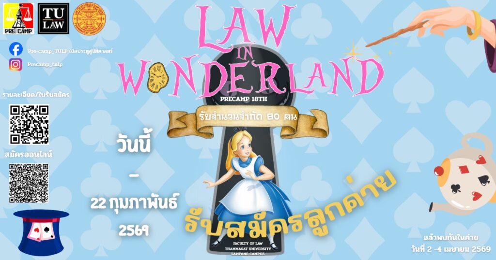 ⏰ สิ้นสุดการรอคอยสำหรับน้อง ๆ มัธยมปลาย ม.4 – ม.6 ค่ายเปิดประตูสู่นิติศาสตร์ Pre-camp ครั้งที่18 ได้กลับมาอีกครั้งใน concept “Law in wonderland” พร้อมแล้วที่จะหาผู้กล้าที่จะเรียนรู้ความเป็นนักศึกษานิติศาสตร์ว่าเหมาะกับตนเองหรือไม่ไปด้วยกันในดินแดนมหัศจรรย์ แล้วมาพบกัน ณ มหาวิทยาลัยธรรมศาสตร์ ศูนย์ลำปาง