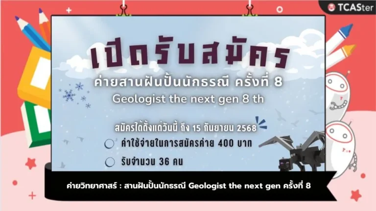 ในค่ายวิทยาศาสร์นี้ น้อง ๆ จะได้เรียนรู้เกี่ยวกับ “ธรณีศาสตร์” ทั้งในห้องเรียนและนอกห้องเรียน ลองใช้เครื่องมือจริง ๆ ลงมือทำกิจกรรม สนุกกับกิจกรรมกลุ่ม เหมือนได้ออกสำรวจโลกผ่านมุมมองใหม่ ๆ  เพื่อส่งมอบประสบการณ์ความรู้เกี่ยวกับสาขาธรณีศาสตร์ให้น้อง ๆ ได้ค้นพบตัวเอง ! วันที่จัดกิจกรรม 23 – 26 ตุลาคม 2568 วันที่รับสมัครวันสุดท้าย 15 กันยายน 2568 จำนวนที่รับ 36 คน ค่าใช้จ่าย 400 บาท คุณสมบัติ (ระดับการศึกษา / ช่วงอายุ / อื่น ๆ) สำหรับน้อง ๆ นักเรียนชั้นมัธยมศึกษาปีที่ 4 ถึง 6 (ที่มีวิชา คณิต ฟิสิกส์ เคมี ชีวะ หรือวิทยาศาสตร์ รวมอยู่ในแผนการเรียน ) สถานที่จัดกิจกรรม มหาวิทยาลัยมหิดล…