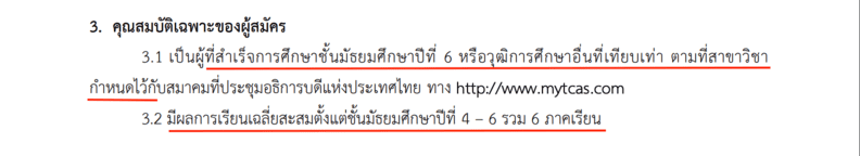 *คุณสมบัติเฉพาะเป็นสิ่งที่น้อง ๆ ต้องเช็กให้ละเอียดและครบถ้วน และน้อง ๆ จะต้องมีคุณสมบัติทุกข้อตามที่คณะหรือสาขากำหนด จึงจะสมัครได้ การพลาดคุณสมบัติบางข้ออาจทำให้ใบสมัครของน้อง ๆ ถูกปักตกได้ เพราะฉะนั้นต้องอ่านระเบียบการให้ละเอียดนะ