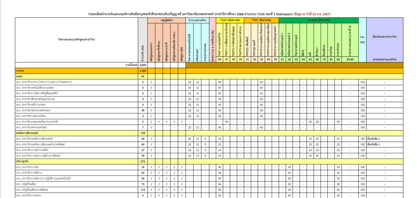 เกณฑ์การพิจารณาคัดเลือกจะบอกน้อง ๆ ว่าคณะกรรมการใช้อะไรเป็นตัวตัดสิน ในรอบ Portfolio และ Quota อาจจะเป็นสัดส่วนคะแนนของผลงานที่กำหนด วิชาเฉพาะ และการสอบสัมภาษณ์ ส่วนในรอบ Admission และ Direct Admission ก็จะเป็นสัดส่วนคะแนนของวิชาที่ใช้ เช่น TGAT, TPAT และ A-Level นอกจากนี้ในส่วนนี้ยังอาจจะมีการบอกจำนวนที่เปิดรับของแต่ละสาขาวิชาด้วย