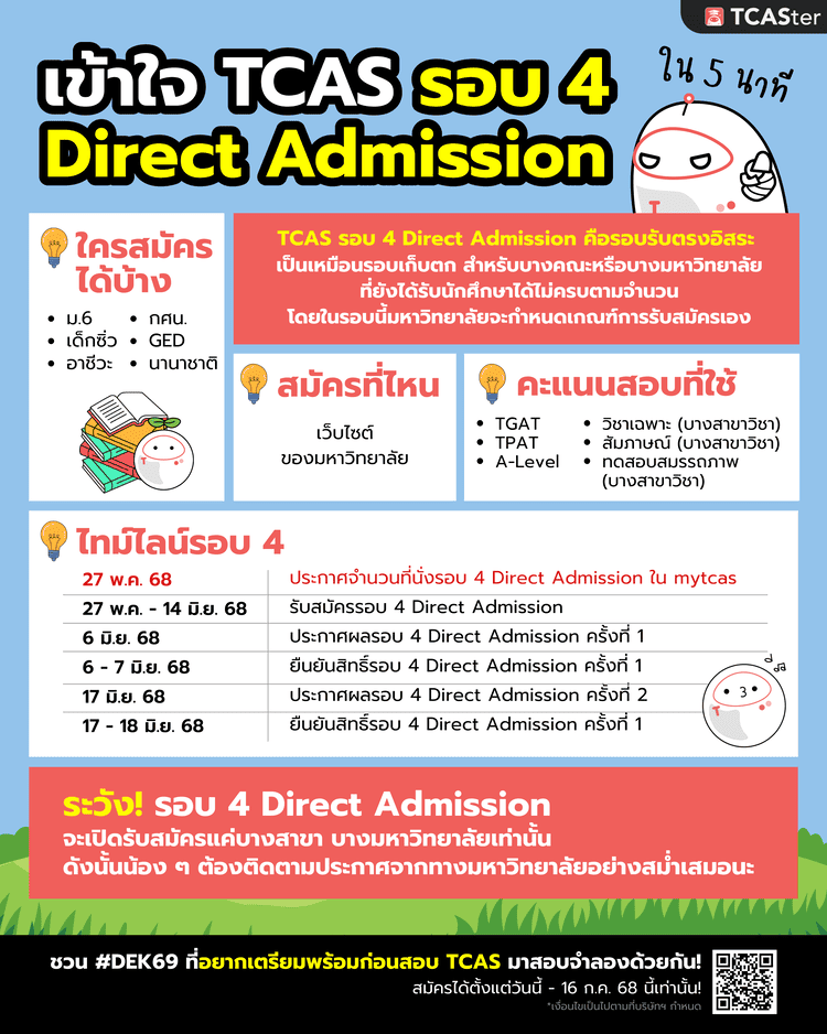 ระวัง! รอบ 4 Direct Admission จะเปิดรับสมัครแค่บางสาขา บางมหาวิทยาลัยเท่านั้น ดังนั้นน้อง ๆ ต้องติดตามประกาศจากทางมหาวิทยาลัยอย่างสม่ำเสมอนะ